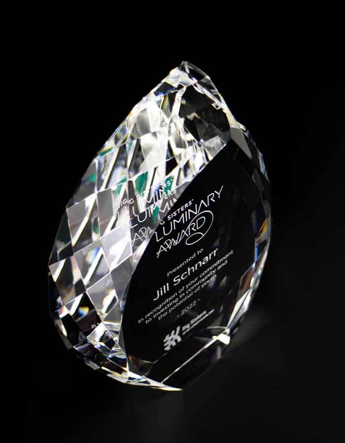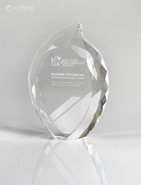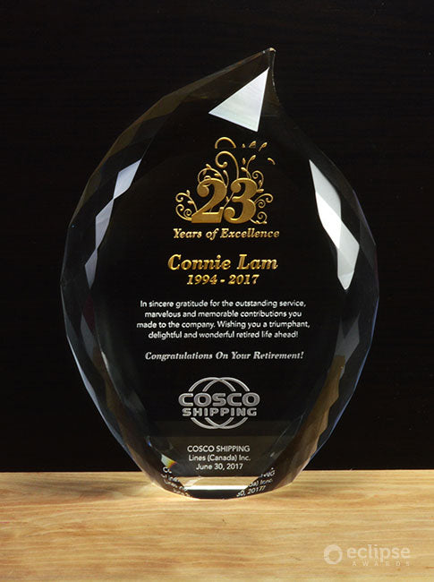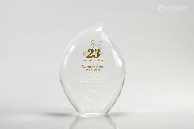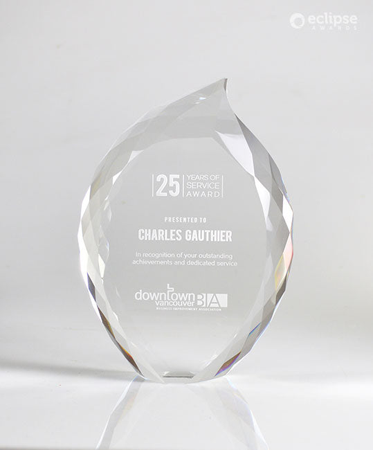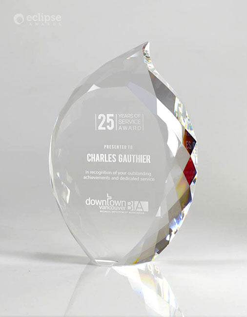 The Crystal Flame is brilliant and inspiring recognition award, magically reflecting light from its many facets. Popular as an elegant years of service award or lifetime achievement award, this eye-catching solid crystal jewel will bring a smile to anyone's face! If you’re looking to host a glamorous or high profile event, crystal awards can help elevate your occasion. Choose between elegant Sandblast Engraving or vibrant Cosmo Color Printing to create a custom award that you will fall in love with.