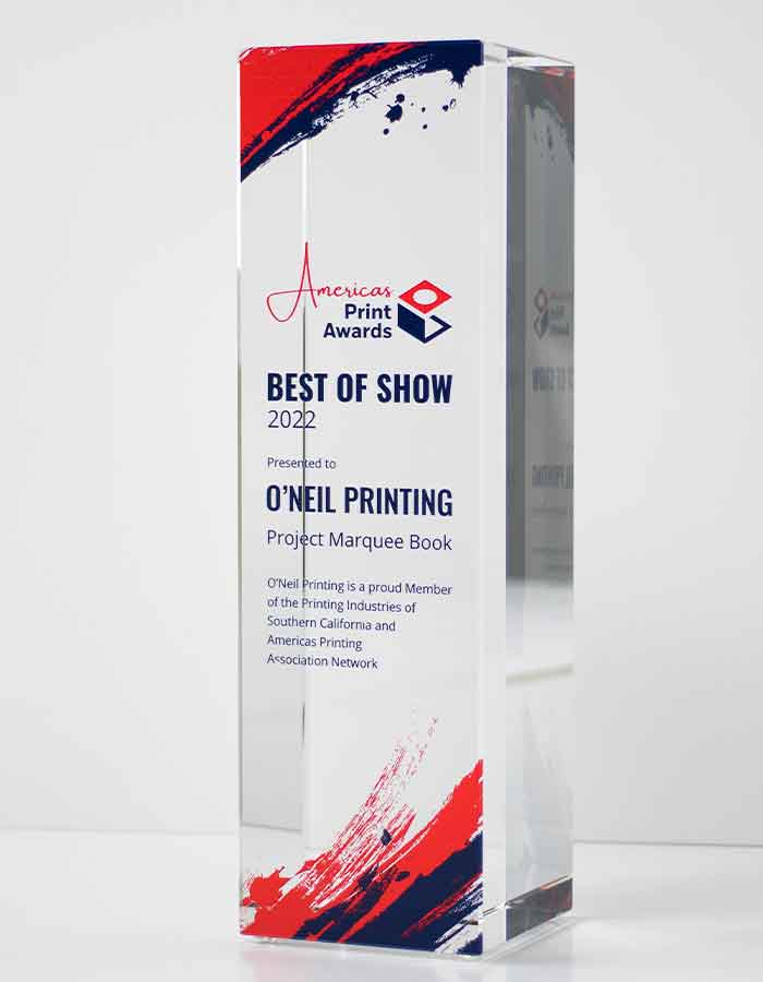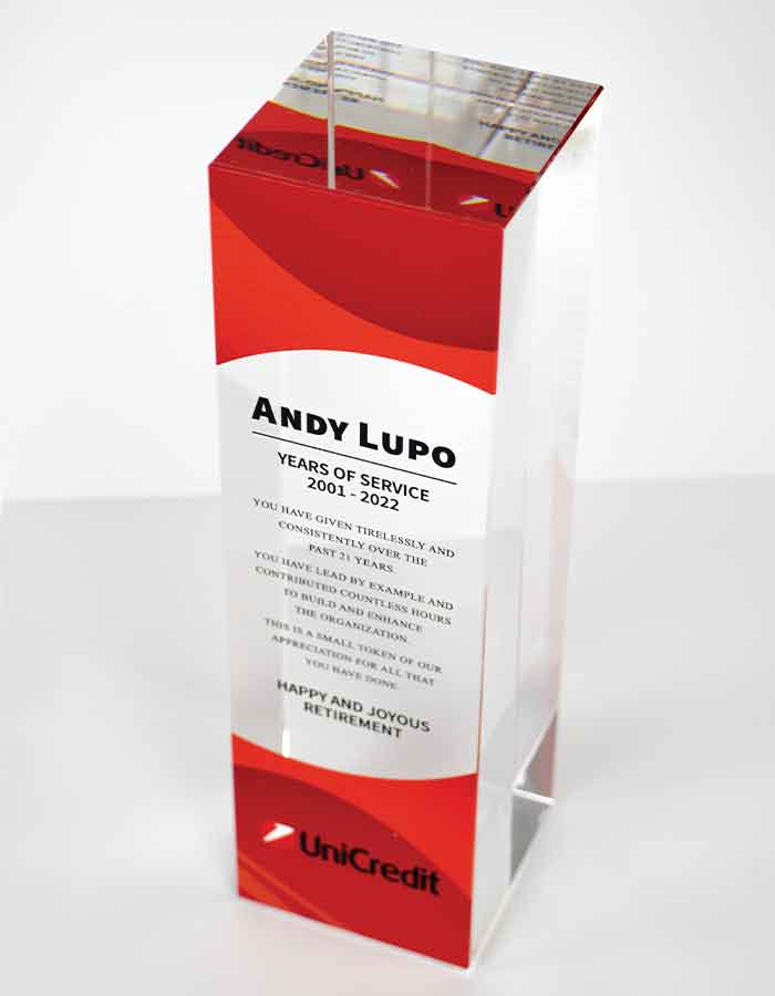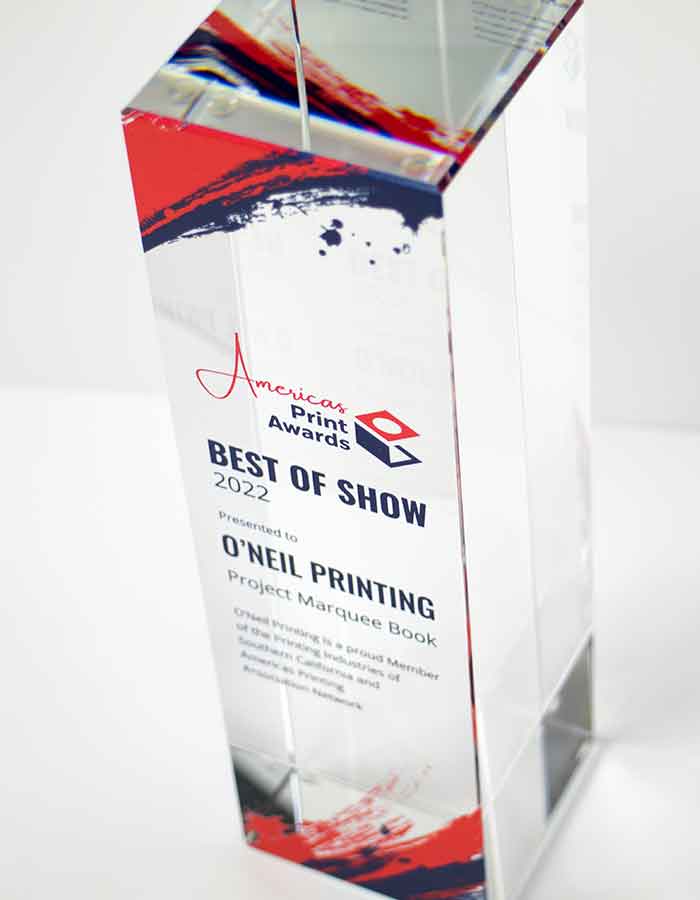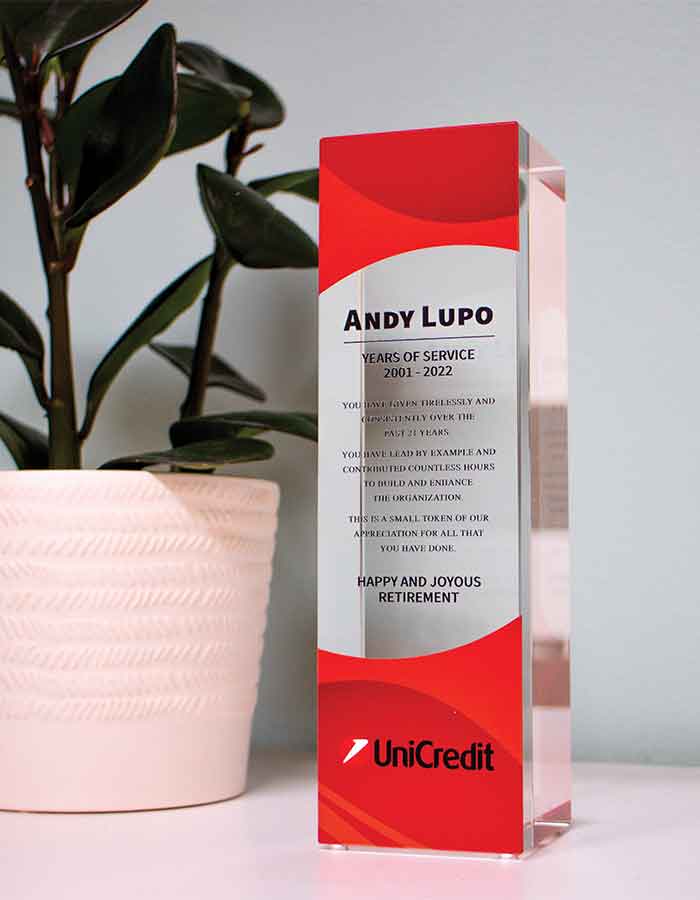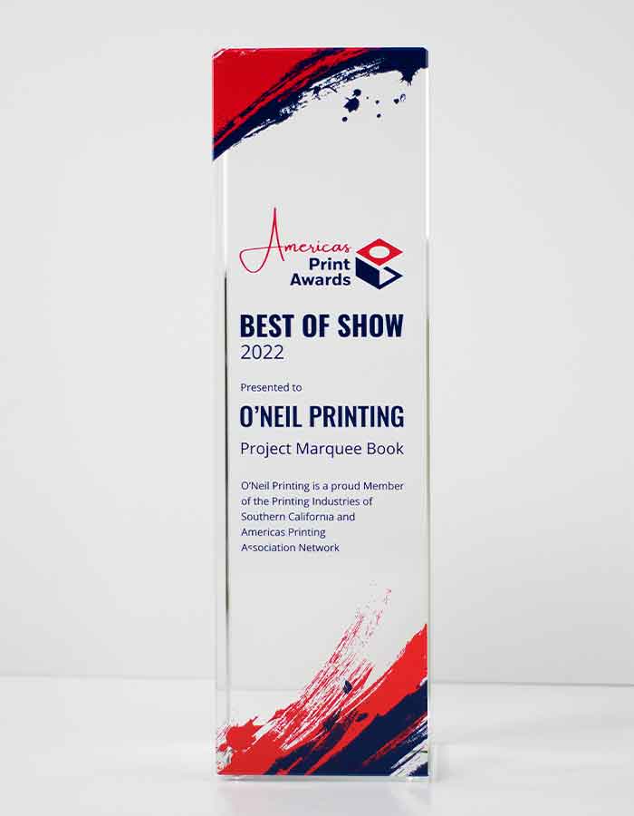 Choose between elegant Sandblast Engraving or vibrant Cosmo Color Printing to create a custom award that you will fall in love with. Explore our inspiration gallery at the bottom of this page to see examples of how this award has been customized.