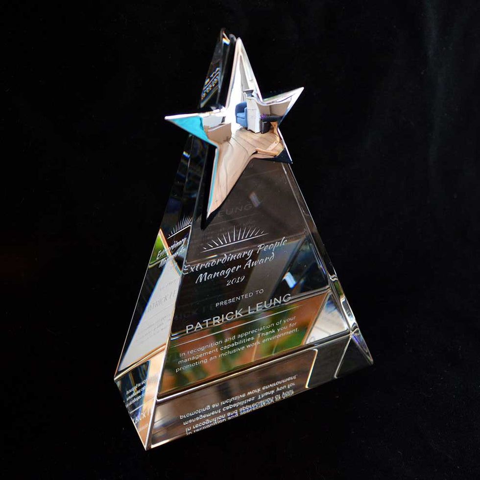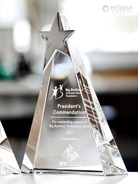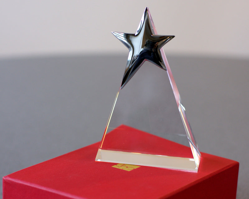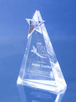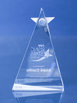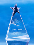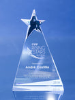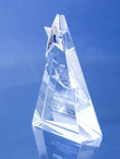 The Crystal Star Peak Award elegantly features a chrome star gracefully perched atop a solid crystal triangle, representing the ascent towards excellence. This prestigious trophy stands as a remarkable choice for honoring employees or participants in a rising star awards program, encapsulating their journey towards distinction and success.